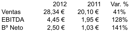 Resultados 2012 vs 2011El otro cambio es la apertura al exterior. La internacionalización hasta 2012 no existía. Han pasado de no tener presencia internacional en 2011 a facturar 4 millones de euros (14% de la ventas totales) el año pasado.