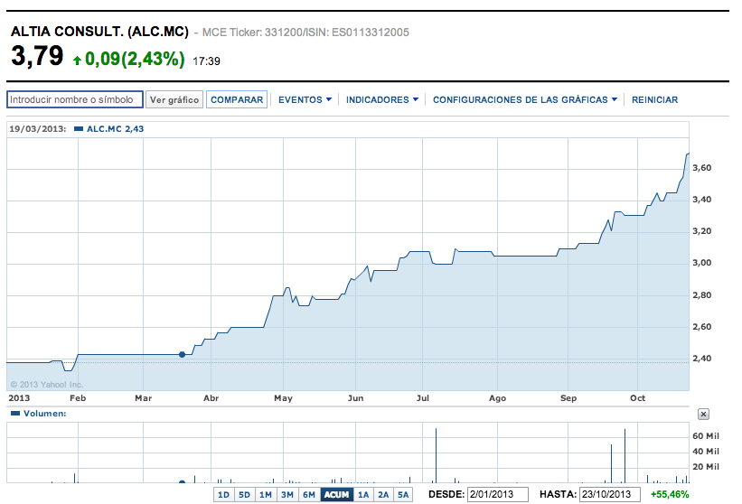 Por otro lado tenemos la evolución en bolsa de Altia. La empresa debutó en el MAB el 1 de diciembre de 2010 a 2,72 euros y este 24 de octubre ha cerrado en 3,79 euros. La revaloración desde el debut ha sido del 39% pero en este 2013 lleva un 59%.