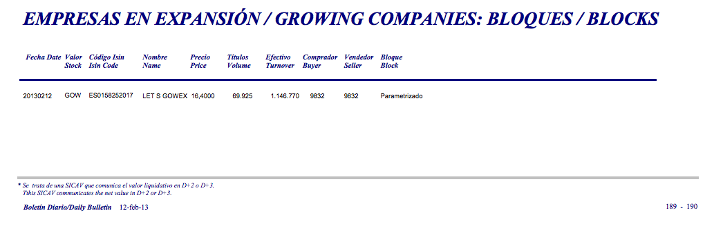 Esto quiere decir que a pesar de que en el caso particular del MAB vemos muchas veces que las empresas no negocian ninguna acción, luego sí que lo hacen en el mercado de bloques. Estas operaciones se pueden consultar en los «boletines diarios» del mercado.