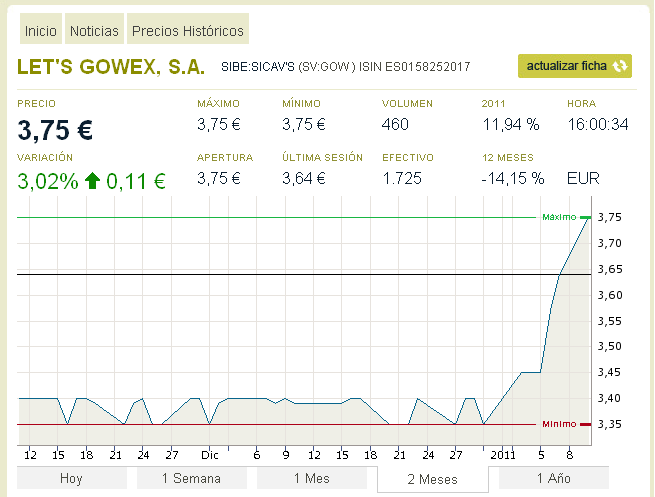 Respecto a Gowex, lo que creo ahora, y espero no equivocarme, es que la cotización de su acción ha empezado a despegar. Gowex terminó 2010 en los 3,35 euros por acción. En la sesión de este pasado lunes, la acción cerró en 3,75 euros, lo que hace que en 6 sesiones después de la última de 2010, Gowex se haya revalorizado un 12%.