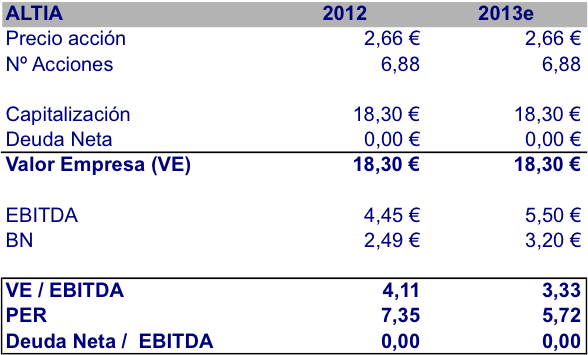 Con la acción de Altia a 2,66€ (cierre 24 abril), la capitalización de la compañía la tenemos en 18,3 millones de euros. Sin deuda financiera neta, el valor empresa de Altia sería igual al de su capitalización (18,3 mill. €). Por lo tanto, sobre los resultados de 2012 tenemos unos ratios de VE / EBITDA de 4x y un PER de 7,35x. Para 2013 estimo que estos ratios puedan bajar hasta un VE / EBITDA de 3x y un PER de 5,7x. El P/FCL (PER fijándonos en el FCL) creo que lo podríamos situar en 7x para 2013. Sin duda que creo que son unos ratios muy atractivos sobre todo viendo el crecimiento de la compañía y que si nos vamos a 2014 (el año que viene) los ratios podrían ser todavía mejores.