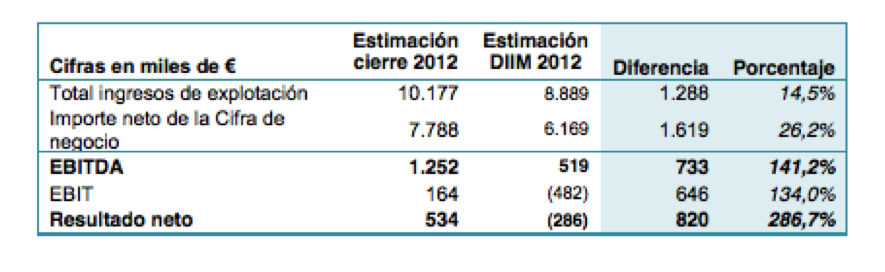 En cuanto a los resultados anuales, aunque no tenemos todavía los resultados auditados, sí que tenemos un avance y una estimación que dio la compañía el 27 de febrero. Los ingresos suben un 14,5% hasta los 10,1 millones de euros, la cifra neta de negocio un 26%, el EBITDA sube un 141,2% pasando de un beneficio de 0,5 millones en 2011 a uno de 1,25 millones en 2012, y por último el resultado neto pasa de unas pérdidas en 2011 de 0,28 millones de euros a un beneficio neto de 0,53 millones de euros.
