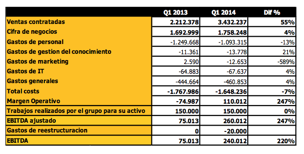 A continuación, si miramos el avance de resultados del primer trimestre de este año, observamos cómo la ventas contratadas crecen entorno al 50% respecto a las del último trimestre de 2013 o respecto a las del mismo trimestre del año pasado (1T13). La facturación (cifra de negocio) no crece tanto pero se espera que lo vaya haciendo en los próximos trimestres. Además, lo que ya sí se refleja en el primer trimestre de este año es un despegue de los beneficios a nivel de EBITDA. Tenemos que en el primer trimestre del año pasado el EBITDA fue de 75.013 euros y este primer trimestre el EBITDA lo sitúan en 240.012 euros (+220%).