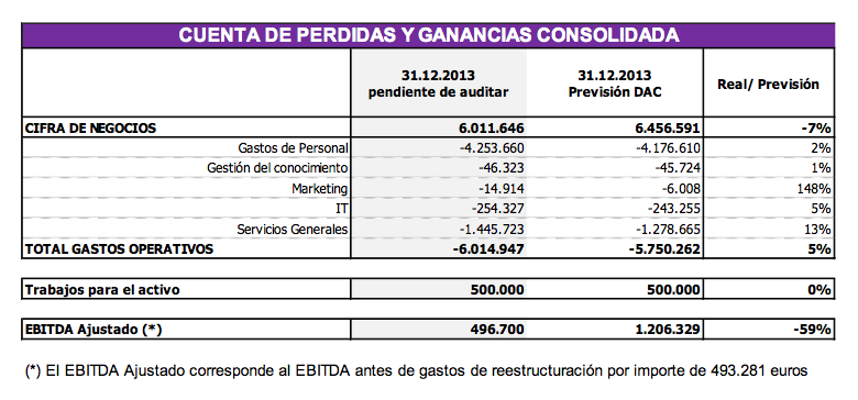 En cuanto al avance de resultados de 2013 señalar que la facturación se ha quedado cerca de lo previsto en su último plan de negocio. Tenían prevista una facturación de 6,45 millones de euros y han conseguido 6 millones. El dato negativo viene a nivel de beneficios que se quedan lejos de lo estimado. Si hay algo positivo, es que esta desviación se va a compensar en los próximos trimestres al haberse demorado la puesta en marcha de algunos proyectos por parte de los clientes en 2013 y que ya en el primer trimestre de 2014 se están iniciando. Hay que destacar el retraso en el inicio de las operaciones principales del Consorcio del Tren de Alta Velocidad de Meca/Medina. Estos retrasos han provocado que en 2013 no se haya podido facturar ciertas cantidades previstas pero en cambio sí que se han incrementado un 5% los gastos generados con el fin de poder afrontar tales contratos. De ahí que haya una distorsión importante en materia de beneficios (EBITDA y Resultado Neto) la cual se está compensando en estos meses.