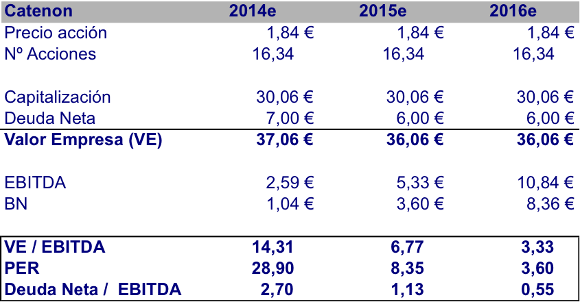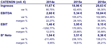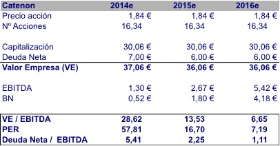 Por lo tanto, estamos ante una nueva Catenon que tiene ya en 2014 todo de cara para crecer de manera importante en cifra de negocio y para borrar de sus resultados los números rojos y empezar a ver beneficios (EBITDA y Resultado Neto).