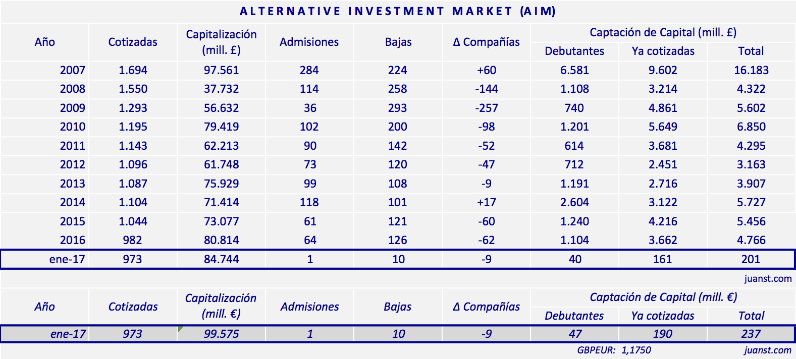 El AIM, el mercado alternativo bursátil de Londres, sigue reduciendo el número de empresas cotizadas. Desde finales de 2007 cuando cotizaban 1.694 compañías, sólo ha habido un año con subida del número de cotizadas, el 2014. Todos los demás años el número ha caído hasta cerrar el 2016 con 982 sociedades.