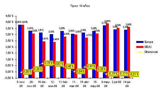 Me suelo fijar en el “10 años”. Desde el mes mayo vemos que se confirma que los tipos de los bonos gubernamentales en EEUU (T-Note) a 10 años cotizan a unos tipos más altos que los comparables en Europa (BUND alemán) a 10 años. En EEUU la rentabilidad de estos bonos está en el entorno del 3,60% y en Europa está en el entorno del 3,39%, es decir, que el diferencial sale positivo para el dólar en 21 puntos básicos.