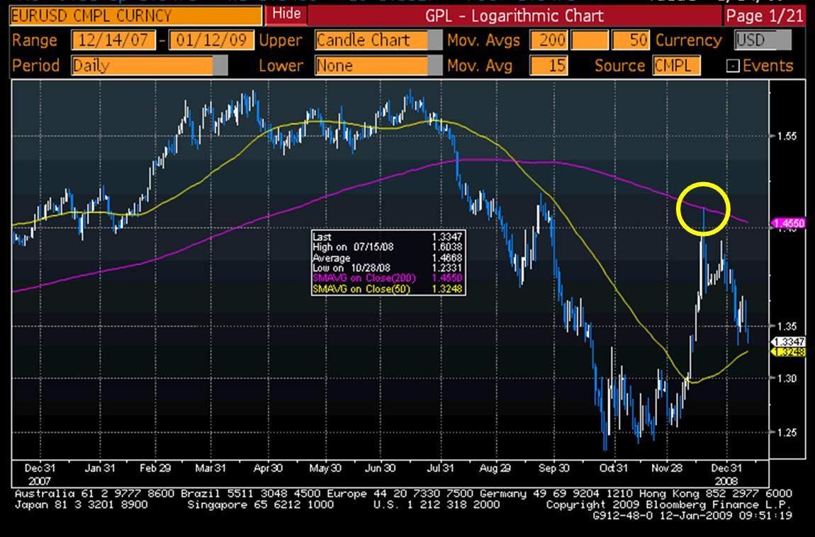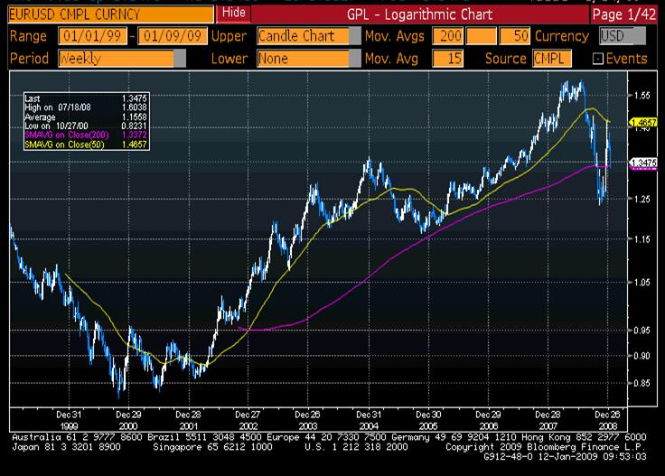 El dólar comienza el año apreciándose respecto al euro, sobre todo si nos fijamos en las últimas sesiones. El par EURUSD terminó 2008 en el entorno de los 1,40 dólares por euro (1,3953) apreciándose un 4,5%. La volatilidad continúa muy alta en este par de divisas pero la tendencia de fondo, para mí, sigue a favor del dólar.
