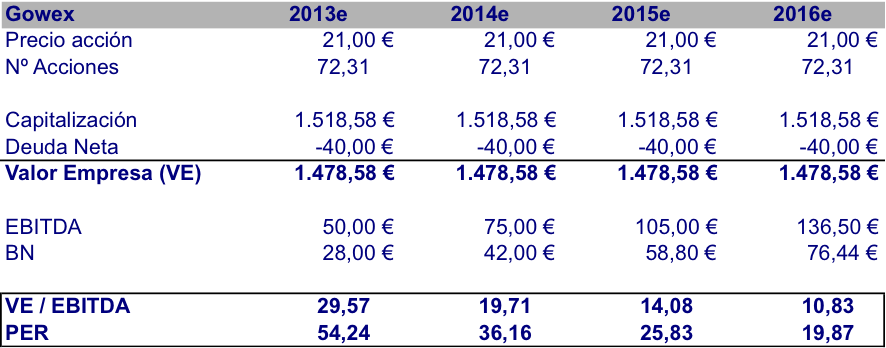 Aunque siempre hay mucho que ajustar y explicar en las previsiones y en las cifras que se pongan a futuro, podemos ver en esta tabla un PER para 2015 de 25,8x y un PER para 2016 de 19,8x con la acción a 21 euros. Podríamos pensar que ya no son unos ratios atractivos. Para mí, una empresa que lleva varios años creciendo a más del 40% en ingresos, que se espera que lo siga haciendo a estas tasas, y que lo beneficios crecen aún a más velocidad (por ejemplo el bº neto en 2012 subió un 136%), creo que es una empresa en la que se pueden justificar perfectamente un PER sobre el año que viene de 25 y un PER de 20x para dentro de dos años. No digo que sea una ganga, pero sí que creo que es atractivo estar en Gowex a 21 euros a un par de años vista con los riesgos y amenazas que supone esta inversión.