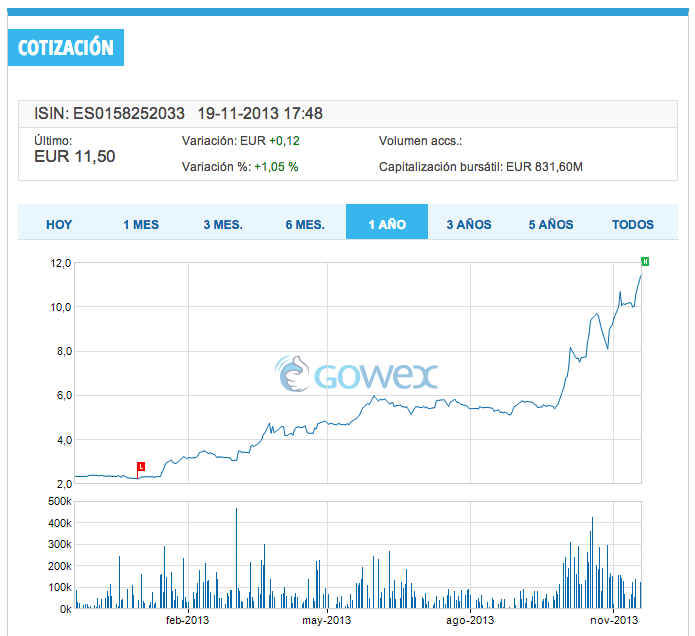 Desde su salida a bolsa en el MAB en marzo de 2010, la evolución de la cotización de Gowex ha sido espectacular. Ha pasado de debutar a 0,70 euros por acción a cerrar este 19 de noviembre en 11,50 euros. Esto supone haber multiplicado por más de 16 su cotización y haber superado actualmente los 800 millones de euros de capitalización bursátil.
