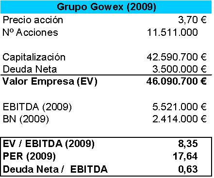 Con la acción de Gowex cotizando en 3,70 euros el EV / EBTIDA (2009) sale 8,35 veces. Un múltiplo más o menos decente. Es decir, que no es barato pero tampoco lo veo excesivo. El PER sale alto pero en estas compañías con un alto potencial, tampoco lo veo desorbitado ya que si el año que viene mejora mucho su beneficio (lo cual es factible dada su condición y su evolución) el PER del 2010 sería mucho más bajo. En cuanto al endeudamiento parece que está bastante bien, es decir, que no está muy endeuda (ratio Deuda Neta / EBITDA es de 0,63 veces)