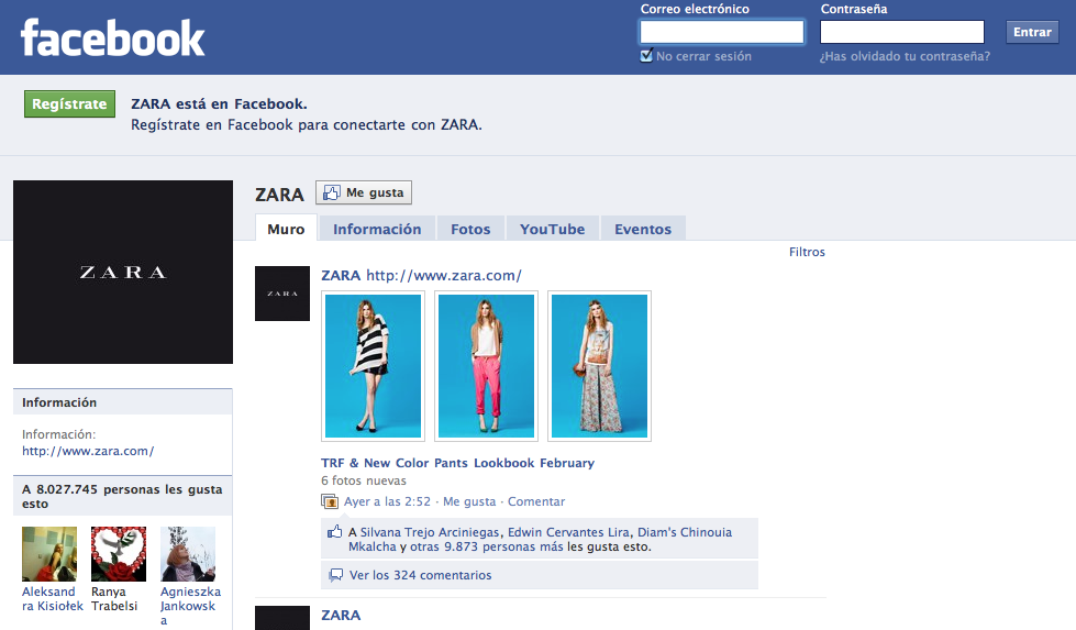 Si miras a cuántas personas les gusta la página de Zara en Facebook, seguramente la página española con más “fans”, verás que son más 8 millones de personas las que le han dado al cuadradito de “Me gusta”. Pero si te fijas bien en su página de Facebook también verás que no es que la actualicen mucho, ni que ofrezcan grandes descuentos, ni ofertas, ni que tenga nada especial. La gente se identifica con la marca, les gusta Zara y pinchan “Me gusta” por lo que es fuera de Facebook, no por lo que es en Facebook.