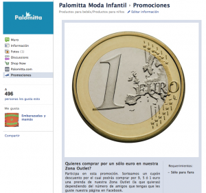 Poco a poco, pero voy introduciéndome cada vez más en el «mundo» Facebook para intentar aumentar las ventas de Palomitta. Tras la buena acogida que tuvo la promoción de regalar una prenda si nos conseguían a 5 fans y tras investigar cómo seguir haciendo promociones para aumentar a nuestros seguidores, he visto que existe una prohibición por parte de Facebook a hacer promociones y administrarlas si no se hace mediante una aplicación “oficial” de esta red social. Avisan que podrían llegar a cerrar la página si se observan promociones que no sigan las “Normas de Facebook”. De todas formas, no creo que se vayan a cerrar muchas páginas por este motivo, pero bueno.