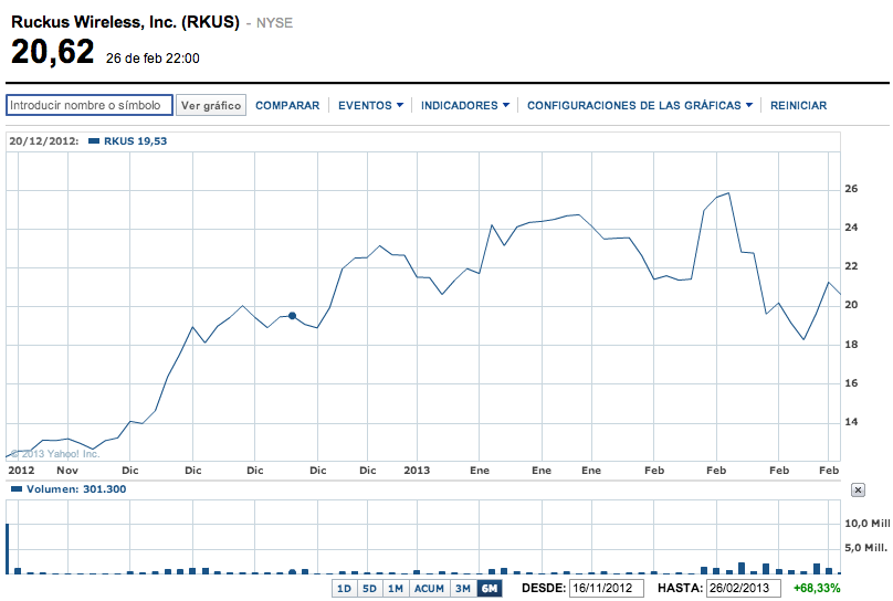La empresa Ruckus salió a cotizar en la bolsa de Nueva York en noviembre de 2012Captó 126 millones de dólares y debutó con una capitalización de más 1.000 millones de dólares. En este caso en concreto, pienso que sí que podemos decir que debutó con unos precios un tanto elevados pero las previsiones “aguantaban” esa valoración. La cotización de la acción se fijó en 15 dólares antes del debut en bolsa, con un PER de 81x. El precio además suponía 5 veces las ventas y 7 veces el valor en libros. Este precio de colocación provocó que el primer día de la compañía en bolsa, la acción cayera con fuerza, cerrando en 12,25 dólares con una caída del 18%. En cambio, la evolución ha sido muy positiva desde entonces. Este martes 26 de febrero cerró a 20,62 dólares con una capitalización de 1.530 millones de dólares. A este precio el PER de 2012 de la compañía es de 48 veces el beneficio. Como siempre, es importante señalar que en este tipo de compañías cuyos beneficios se supone que crecerán bastante en los próximos años, el PER del año pasado tampoco es muy representativo. Habría que intentar ver el PER de 2013 o 2014 para hacernos una idea de cómo está cotizando la compañía. El PER por tanto en un par de años podrá bajar a la mitad si sigue con esta tasa de crecimiento.