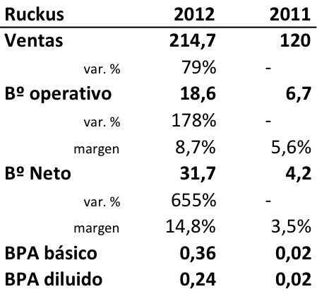 Crece en 2012 casi un 80% los ingresosel beneficio operativo crece un 178% y el beneficio neto un 655%. Impresionante. Hay una particularidad al final de la cuenta de pérdidas y ganancias ya que el beneficio antes de impuestos es de 14,5 millones y gracias a unos beneficios fiscales pasa de estos 14,5 millones de beneficios antes de impuestos a 31,7 millones de beneficio después de impuestos. Pero bueno, podemos también comparar las dos cifras de beneficios antes de impuestos sin beneficios fiscales (14,5 mill. vs 4,5 mill.) y observamos que el crecimiento en 2012 ha sido del 221%.
