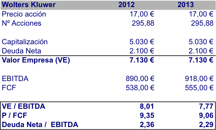 Éste otro riesgo lo añado yo ya que aunque el nivel de endeudamiento no es que sea muy elevado, creo que tampoco es bajo. Este 2012 el ratio Deuda Neta / EBITDA se ha situado en 2,4x. Si por cualquier motivo no hacen crecer el EBITDA y la deuda neta aumentara acercándose hasta 3 veces EBITDA, creo que este nivel ya empezaría a ser alto y por tanto deberíamos tener cuidado con las consecuencias derivadas de dicho endeudamiento.